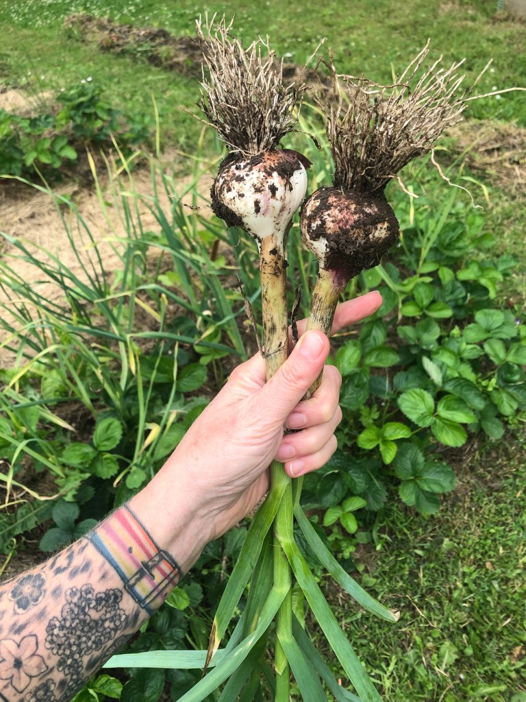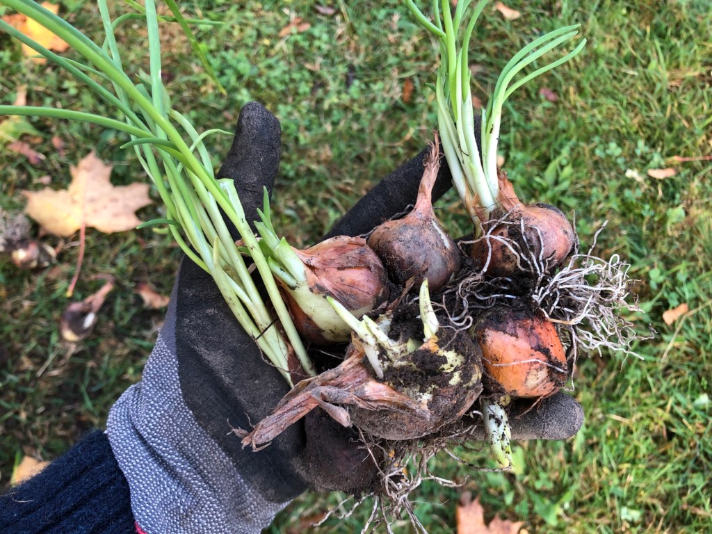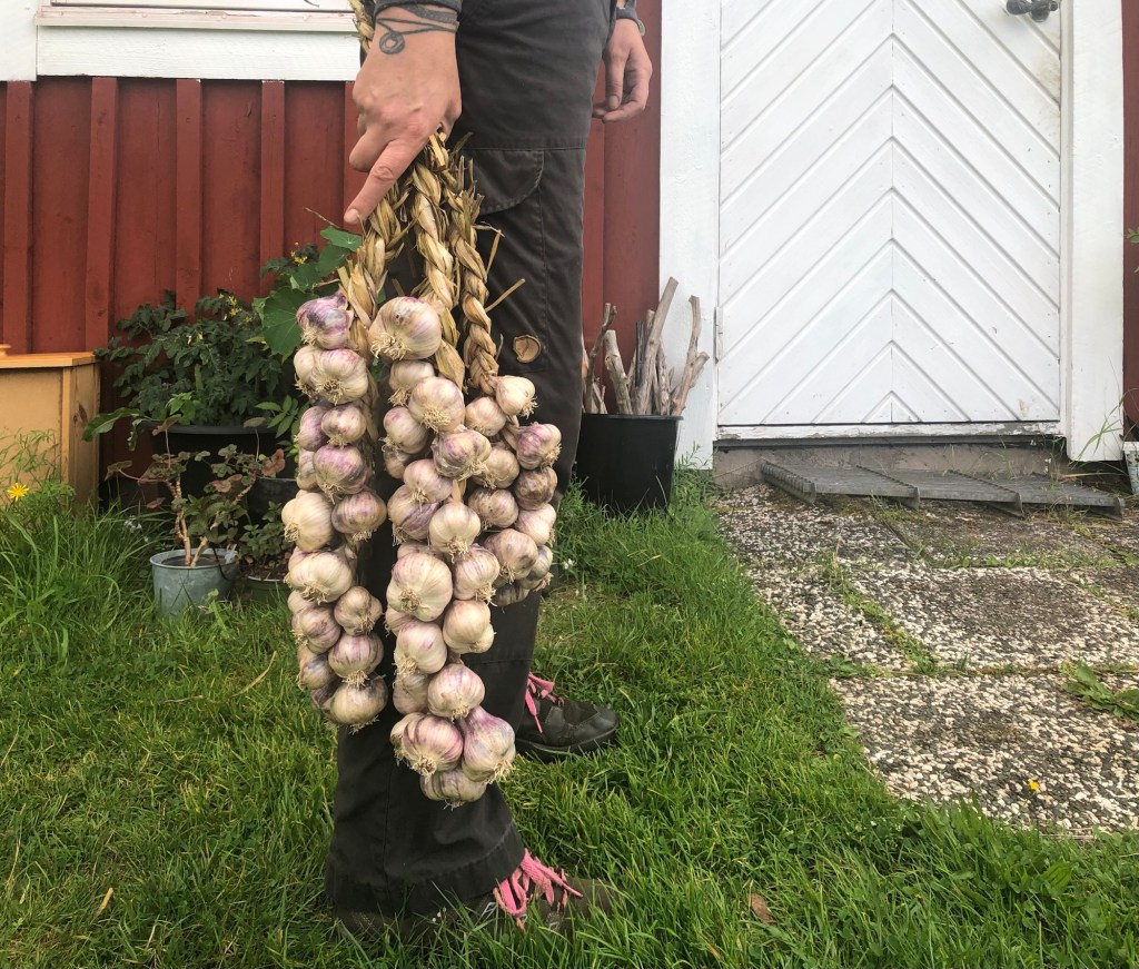 Jag satte Longor och Beddinge i slutet av oktober, men kommer framöver att sätta till våren istället. Biztro sattes lite för sent för att hinna växa till sig och därför sattes alla lökar ner igen när de togs upp i september. Vi fick några röda sättlökar (okänd sort) av en vän. Den trivdes bra och var god, men får nog inte plats nästa år. De 3 vitlökssorterna glömde jag märka upp och då sorterna är lika gick de inte att urskilja från varann ens efter skörd.
