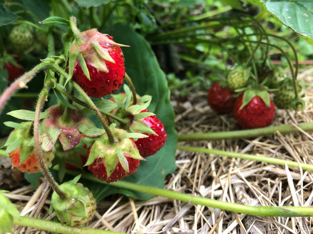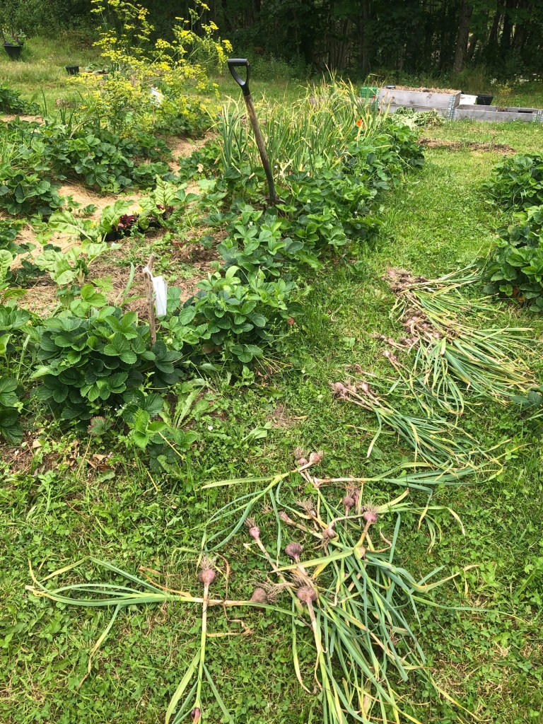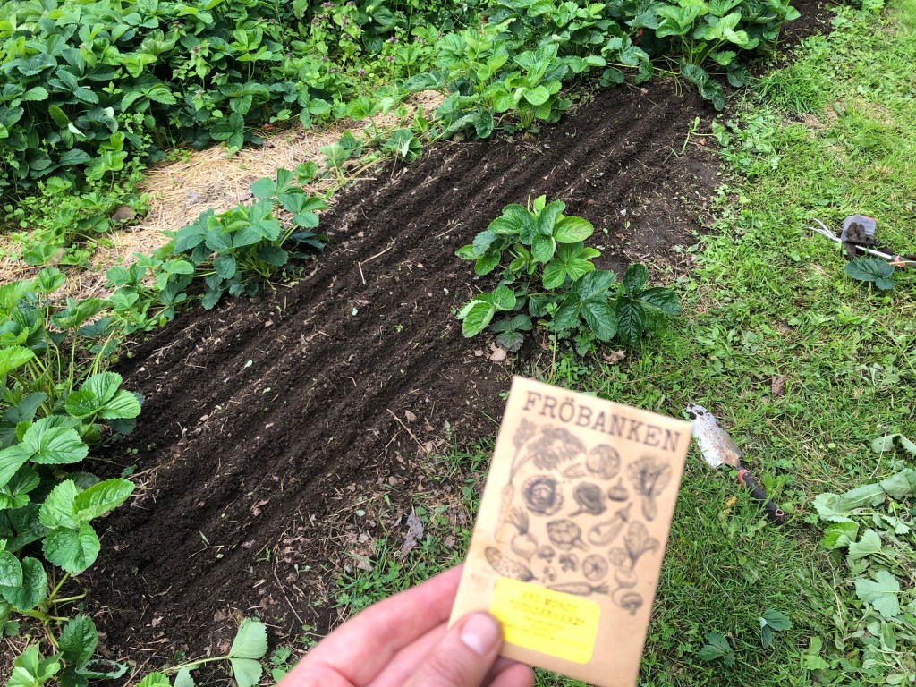 Jordgubbsplantorna runt bäddarna bredde ut sig över hela ytan i två av tre bäddar. Då jag ville ha mycket bär lät jag dem vara och kompromissade med att inte så något mer än morot och rödbeta. Glad över jordgubbsfrossan men har saknat rotsaker. Nu har en del jordgubbar fått flytta och kan bre ut sig på andra platser.