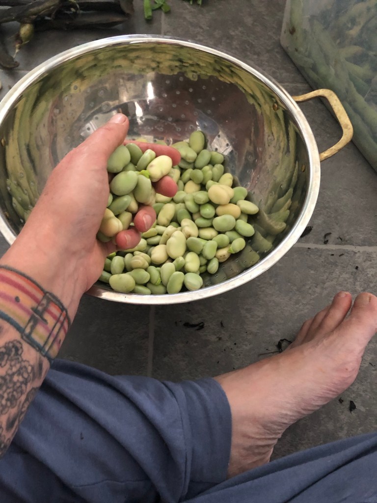 Inläggets översta bild visar mig med ett knippe av bondbönan Threefold White.