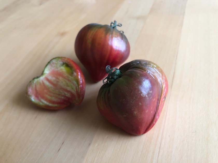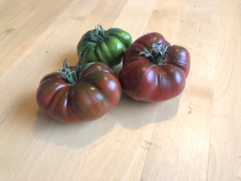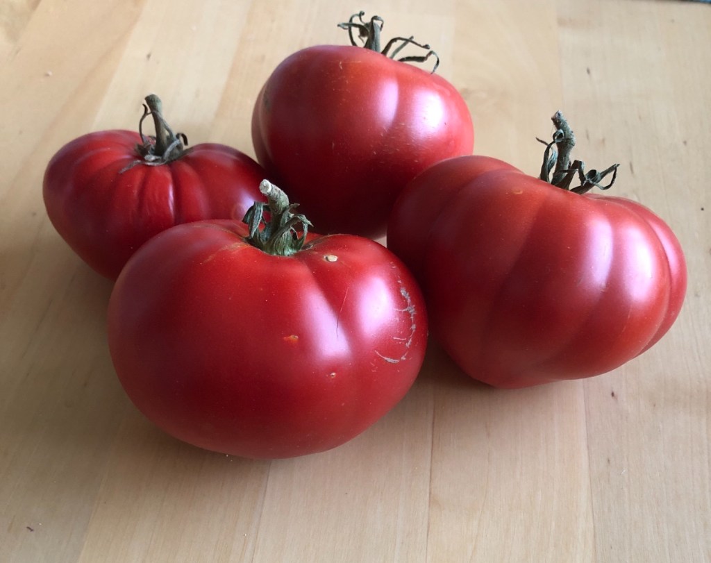 Favoriten är den här röda. Den kan vara en ur Brunbjörn-familjen, men vet inte säkert. Vissa är plattrunda, typisk biff, och andra är något hjärtformade. Plantan är stabil och ger massor. Frukten är smakrik och jättegod.