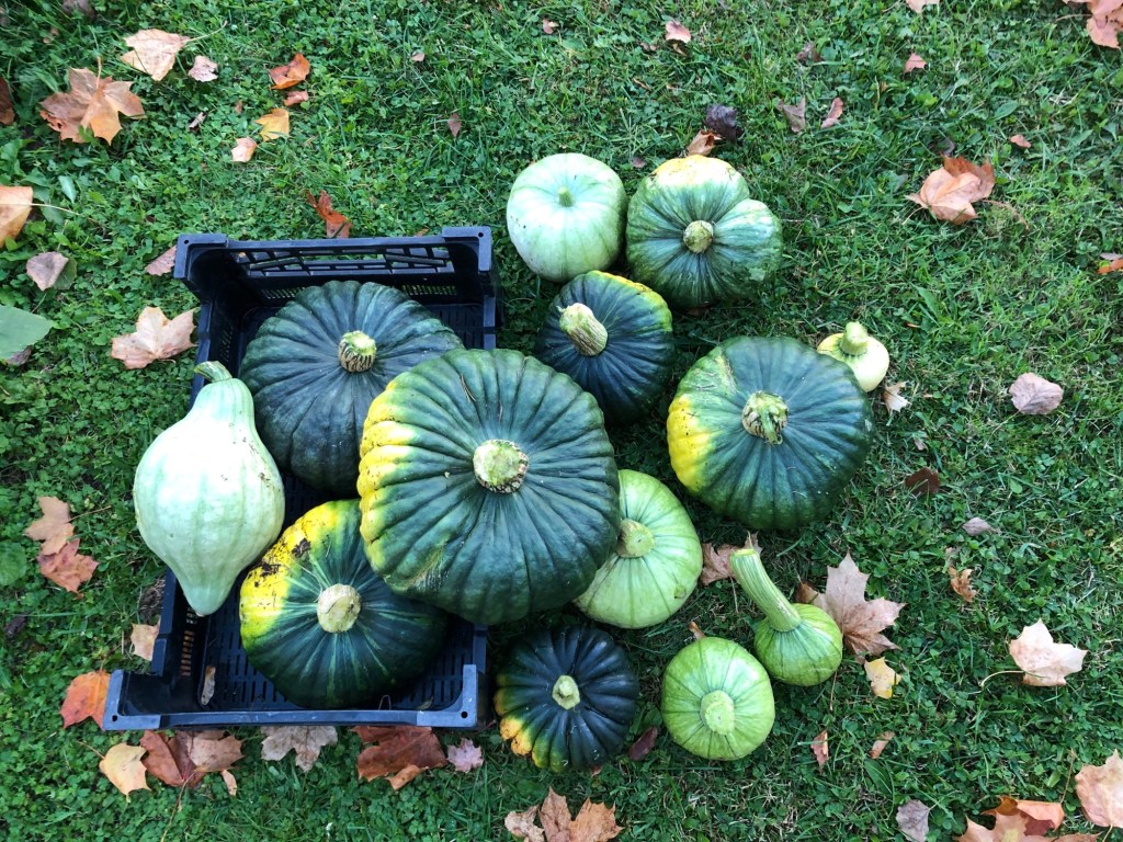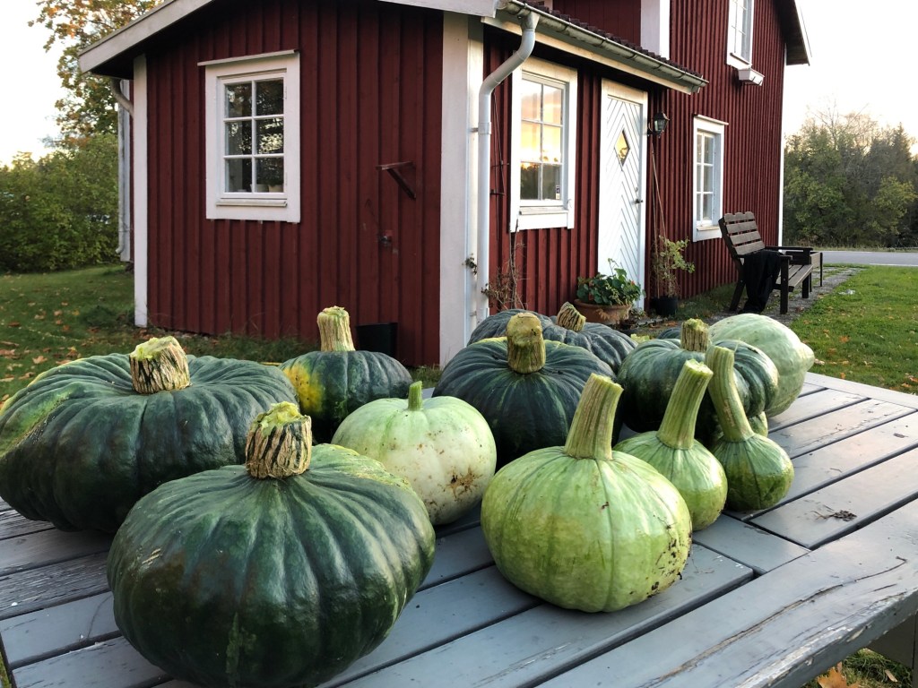 Vårt första år med pumpa blev bra. Stor skörd av en sort och en av varje av de andra sorterna. Dock ingen squash, men det gjorde inte så mycket. Pumpa kommer vi kunna äta hela vintern.