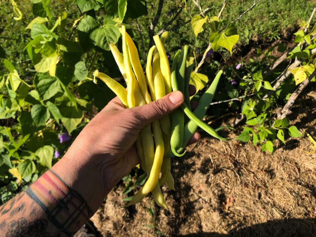 (Fröbanken.) Kom igång sent då det blev kallare vid utplanteringen och en tid framöver. Gav ändå en hel del. Goda, trådfria, stora vaxgula bönor med mild smak.